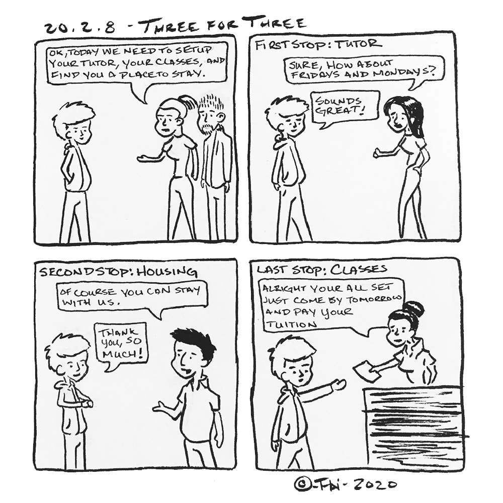 Starting at the beginning of 2020, I decided to capture some moment, event, or circumstance from each day in a four panel comic for 30 days.