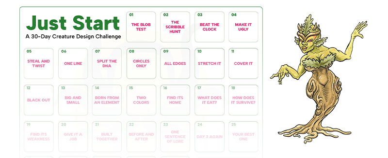 If you're looking for a way to build that kind of structured daily practice, the Just Start Challenge is a free 30-day creature design prompt series built around exactly this principle: one completable task per day, a clear finish line, and a low-stakes way back into the work.
